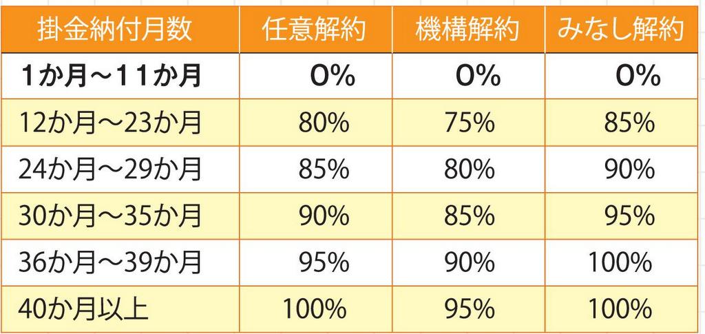 以下の表のとおり、40か月以上積立を継続すれば、納めた掛金が100%返還されます。