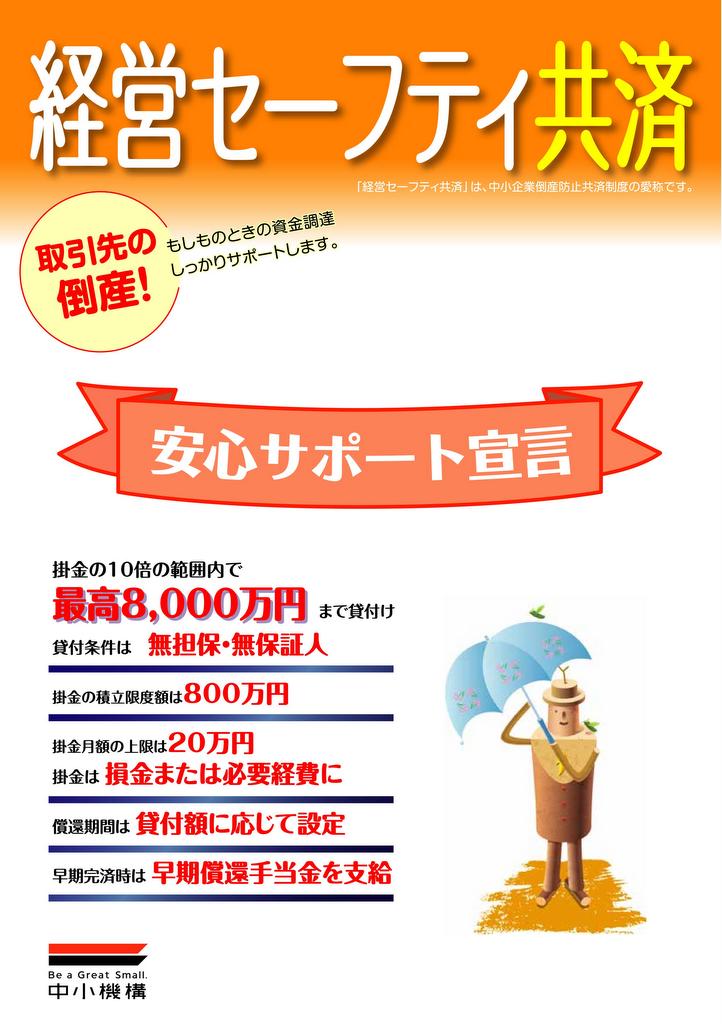 倒産防止共済(経営セーフティ共済)は、上のパンフレットのとおり、取引先の倒産によって連鎖的に経営が行き詰まることを防ぐために作られた、中小企業や個人事業主向けの制度です。