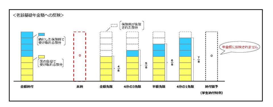 免除や猶予の状態ですと上の図のとおり、将来の年金受給額が減ってしまいます。