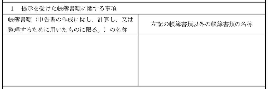 はじめに、「提示を受けた帳簿書類に記載されている事項」には、税理士が会社から提示を受けた書類を記載します。